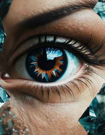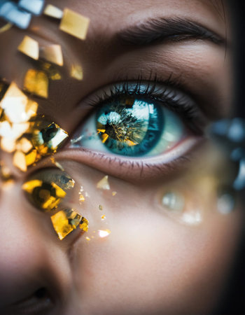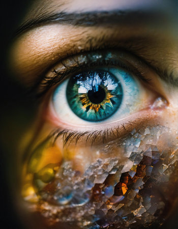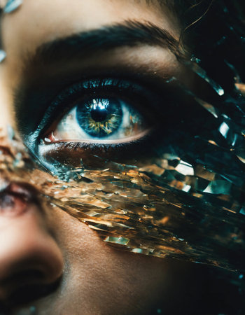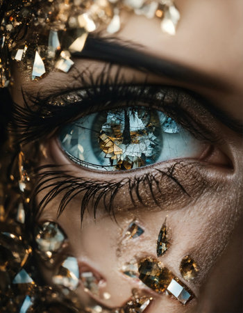 This artistic close-up portrait features a young woman with mesmerizing eyes and sparkling geometric reflections, creating a captivating and elegant visual experience.