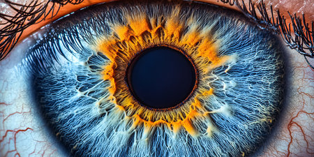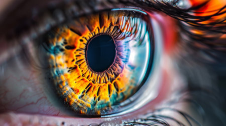 A stunning close-up reveals the intricate patterns and vibrant hues of a person's eye, featuring a blend of blue and orange colors that captivates attention.