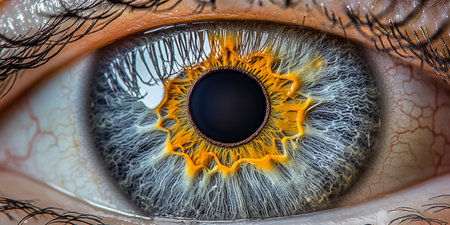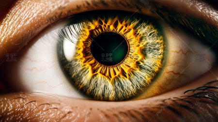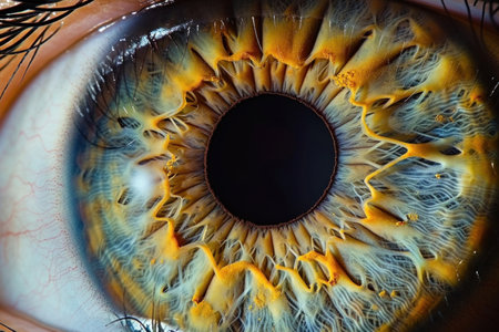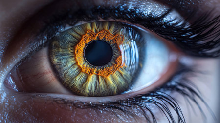 Close up of a human eye showcasing vibrant orange and yellow iris details, conveying depth and emotion, perfect for various artistic and health concepts