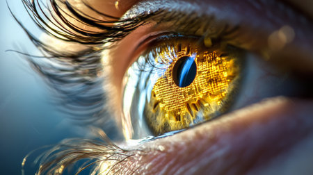 Close up of an eye with golden iris featuring an intricate electronic circuit, reflecting technological advancements in vision and futuristic concepts