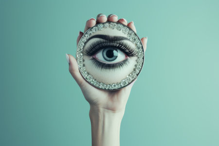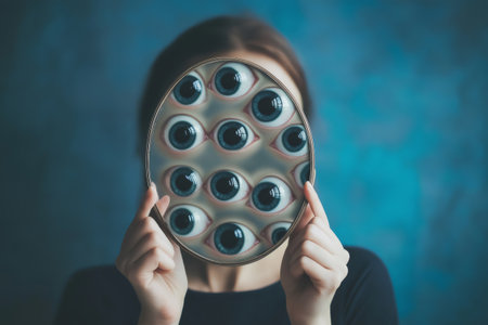 Woman holding a round mirror, reflecting numerous eyes, evoking feelings of paranoia and surveillance in a surreal, abstract setting
