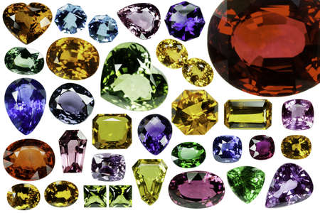 Beautiful faceted natural stones of sapphires, topazes and amethysts on a white background.