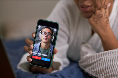 Young adult Black woman holding smartphone showing dating app profile of young Asian wearing glasses, lying on bed, engaging in online dating activity