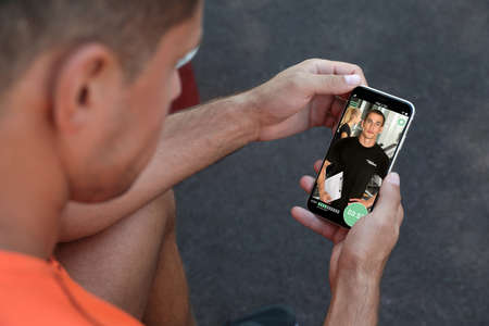 Video teleconference concept. Telemeeting on phone, distant conference trought internet during work from home as impact of the coronavirus global pandemic
