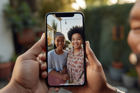 Woman using mobile phone and taking photos of her smiling pretty young friend