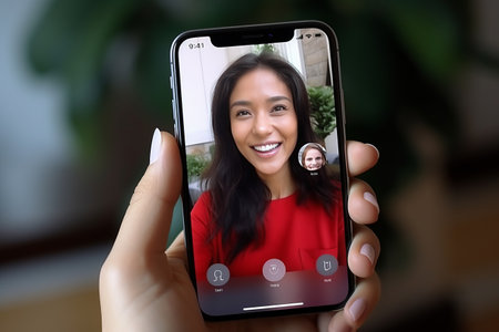 A hand holds a smartphone displaying a cheerful woman during a video call, radiating warmth and connection. The cozy workspace setting, complete with a coffee mug and computer, enhances the inviting atmosphere of modern communication.