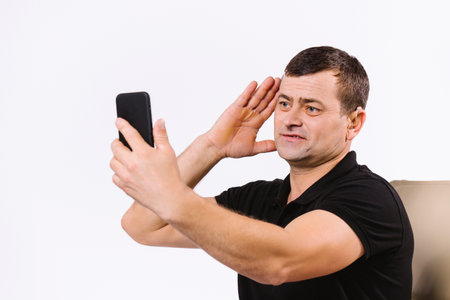 Happy man chatting with friend over online videocall on smartphone, doing friendly gestures. Smiling person communicating with mate on teleconference using mobile phone, studio background, camera B