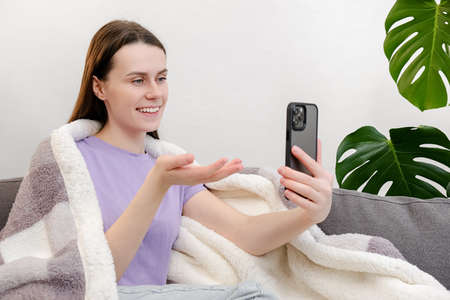 Happy cute young female vlogger holding smartphone talking to camera shooting vlog, making video call sitting on comfortable sofa covered plaid at home talking by virtual mobile video call chat app