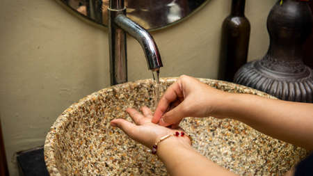Woman wash hands with soap in the sink with water.
