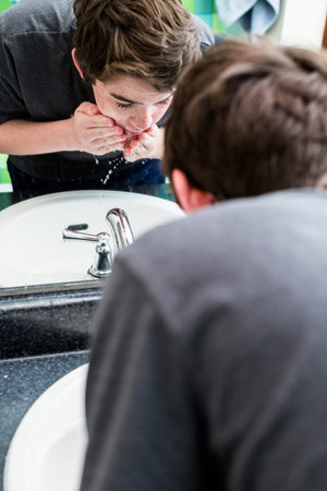 teenage boy cleaning face with a clean water