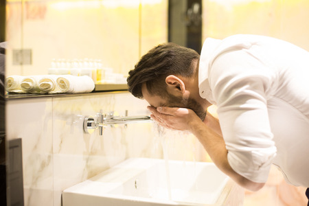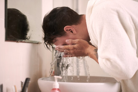 Young man in soft white bathrobe bending over sink in front of mirror in bathroom and washing his face during daily hygiene procedures