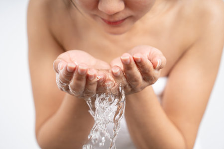 Asian woman splashing water on her beautiful face on white background