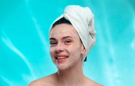 Close up portrait of young woman washing her face with soap and water