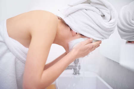 A young woman in the bathroom with a towel on her head washes her face with tap water.