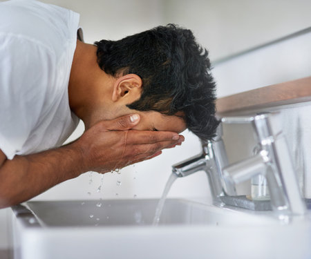 Helping my skin restore its Ph balance. Shot of a man washing his face in the bathroom sink.