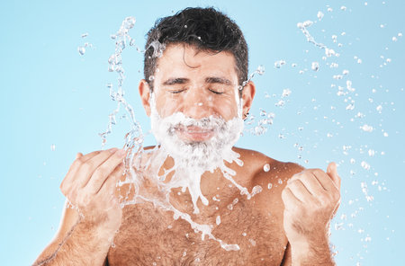 Man, shave and water splash for beauty in studio with wellness, health or self care by blue background. Model, cream and water with hands for healthy facial, self love or cosmetics by studio backdrop