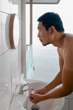 Asian man washing his face in front the mirror in the bathroom in the morning with view.