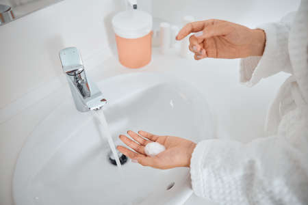 Close up details of woman washing hands at home . Hygiene and body cleaning concept detail