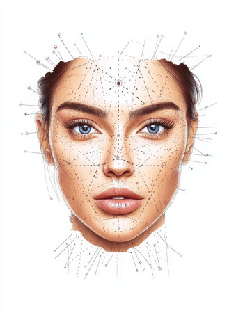 A womans face adorned with intricate lines and dots in a futuristic, artistic display of beauty and creativity.
