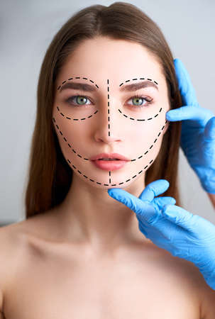 Beautiful young woman with perforation lines on her face before plastic surgery operation. Beautician hands in gloves touching woman face. Puncture lines on pure female skin. Surgeon measures face.