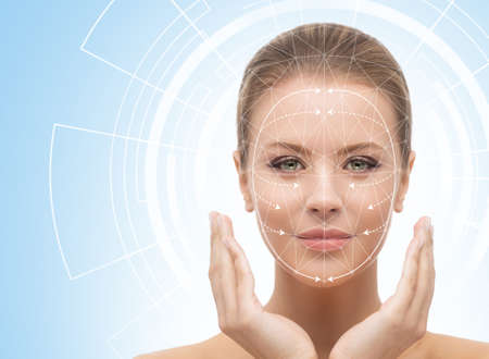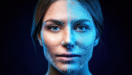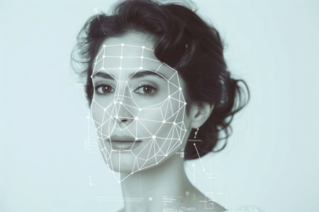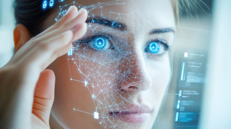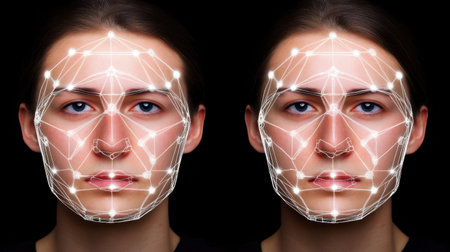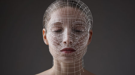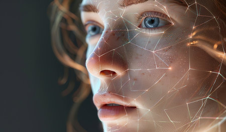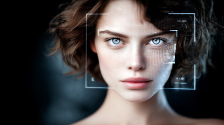 Close-up of a woman's face with digital biometric grid lines, illustrating advanced facial recognition technology.