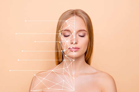 Face of a beautifyl girl with a scanning grid on her face. Face id, security, facial recognition, authentication technology.