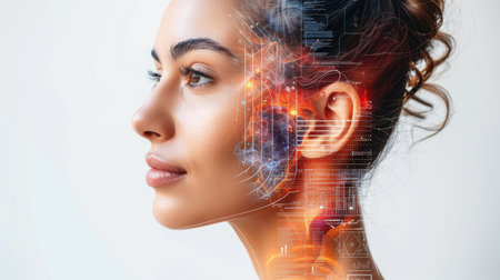 This intriguing image features a woman adorned with a sophisticated digital interface overlaying her face, symbolizing the advance of technology and artificial intelligence. It provokes thought about the relationship between humans and machines, as well as exploring how AI impacts our daily lives, future developments, and ethical considerations.