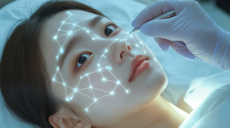 Asian woman receiving futuristic skincare treatment, featuring a glowing grid on her face. a gloved hand applies precision technology, enhancing beauty and precision care.