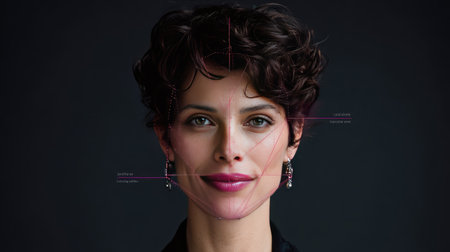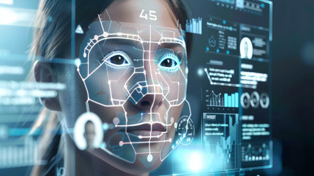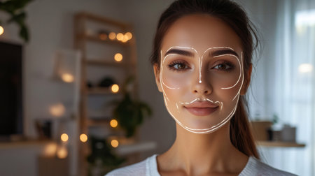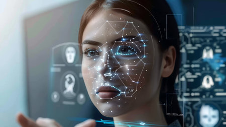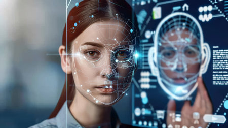 confident woman facing facial recognition technology interface in a modern digital security and biometric identification setting.