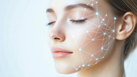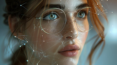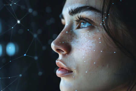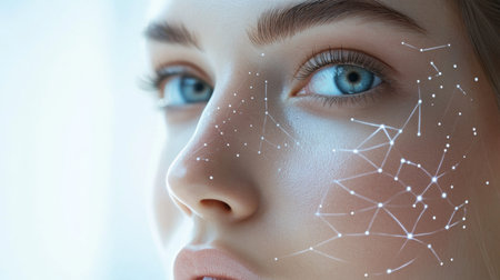 Close-up view of a female face with a digital network overlay, representing the concept of facial recognition technology for various applications in modern society.