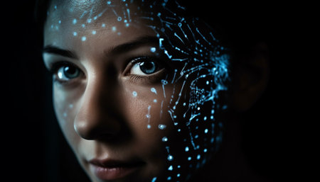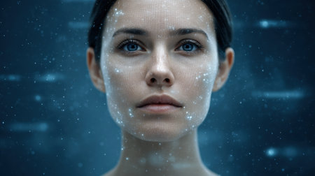 Woman with striking blue eyes looking at camera with digital overlay highlighting facial contours. Dimly lit background adds depth and intrigue. Concept of beauty, technology, digital art.