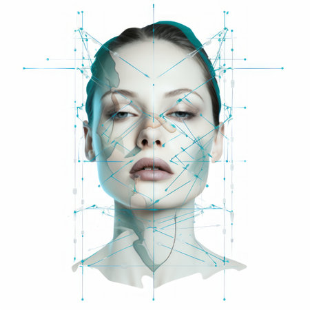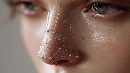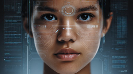 A detailed close-up of a young woman's face, enhanced with facial recognition technology overlay, juxtaposing human features with digital elements against a gray background.