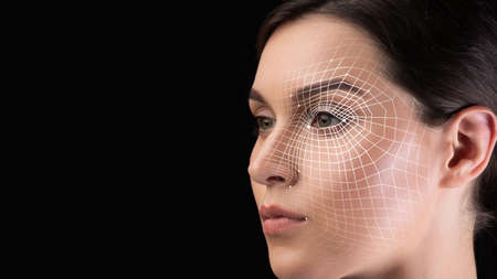 Portrait of young woman with futuristic face recognition concept on dark background