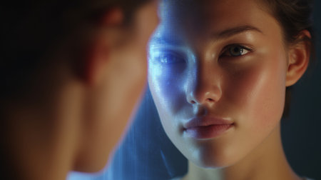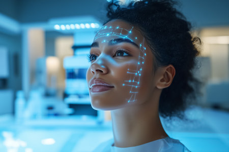 Woman looks at camera while receiving facial recognition analysis in futuristic lab. Glowing digital patterns enhance her features. Concept of beauty tech, medical technology, innovation.