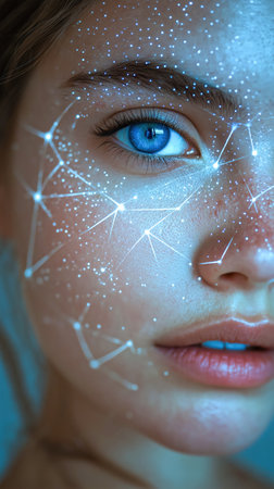 Young woman with blue eyes and glowing constellations on her face