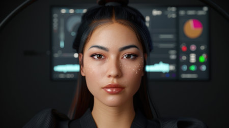 This stunning close-up portrait showcases a woman with sparkling skin in a modern digital workspace, highlighting beauty and technology in harmony.
