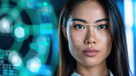 A close-up portrait features an Asian woman with a serene expression, complemented by futuristic data visualization and facial recognition graphics behind her.