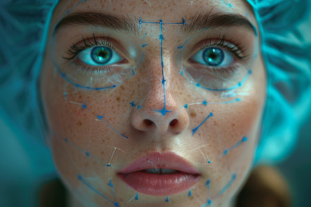 Young woman preparing for cosmetic surgery, drawn line marks on face