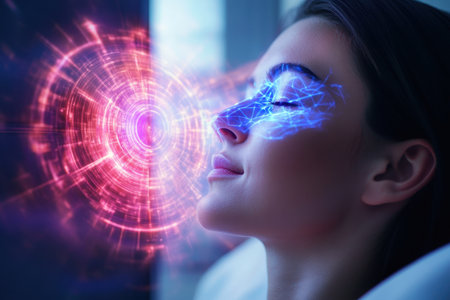 A woman relaxes while futuristic patterns illuminate her face, showing advanced technology and innovation.