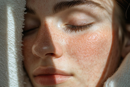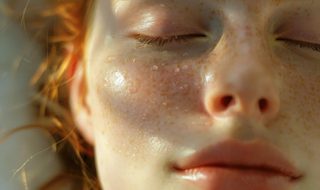 Captivating close-up of a young woman's face emphasizing freckles and natural skin texture, beautifully illuminated by soft natural light, creating an intimate and serene mood.