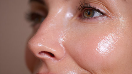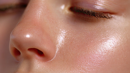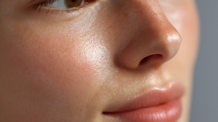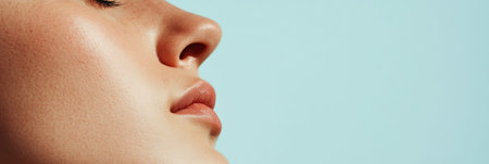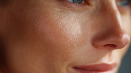 This close-up image captures the delicate features of a woman's face, emphasizing smooth skin and a natural glow, perfect for beauty and skincare themes.
