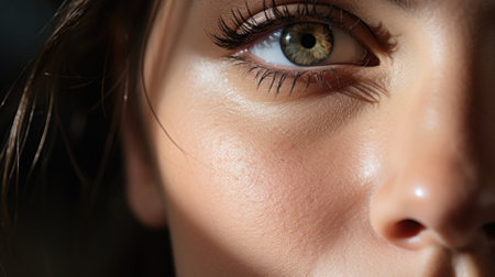 A captivating close-up image showcasing the smooth skin and expressive eye features of a young person. The natural light enhances the details and textures.