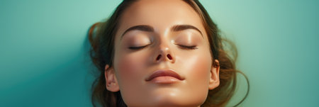 Beautiful young woman with closed eyes on turquoise background.