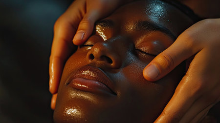 Beautiful young African woman receiving facial massage with closed eyes in a spa center, close-up. Young African Woman Receiving Massage of face At Spa.