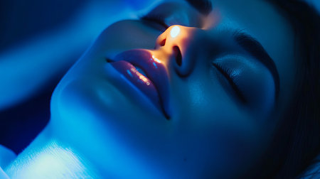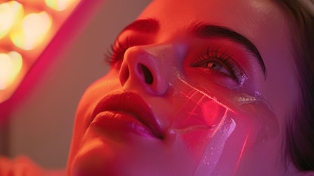 Young woman lying in an infrared therapy room surrounded by soft, undergoing facial therapy with red laser, warm light, blurred background. Skin care, cosmetology, anti aging concept. Generative ai.