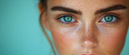 A young woman stands confidently showcasing her captivating blue eyes that are accentuated by her natural freckles and radiant skin. The soft blue background complements her features creating a serene and harmonious atmosphere. Natural light illuminates her face highlighting her unique beauty. Her expression is thoughtful yet engaging drawing the viewer in