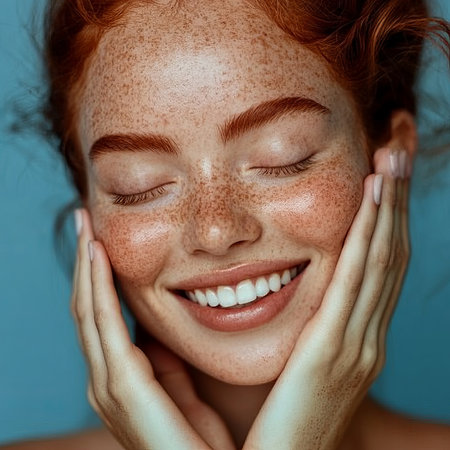 This image features a close-up view of a beautifully freckled face, highlighting the soft lips and natural skin glow. It captures the essence of youth and authenticity.