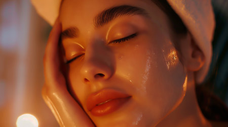 A serene woman enjoying a facial treatment with a glowing mask, surrounded by a calming spa environment.