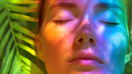 Close-up portrait of a young woman with closed eyes meditating on the background of palm leaves. rainbow colors