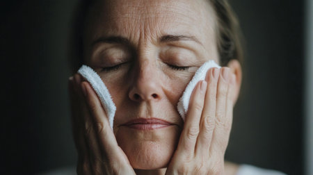 A 50-year-old woman gently cleansing her face with a soft cloth, showing her commitment to skincare.